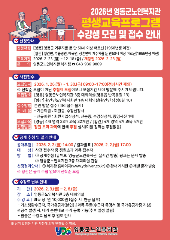영동은 신청 인원이 모집 정원을 초과할 경우 추첨제로 수강생을 선발하며, 공개 추첨은 2월 2일 오후 2시, 유튜브 ‘영동군노인복지관’ 채널을 통해 실시간으로 중계될 예정이다. 황간 지역은 선착순 접수로 수강생을 확정한다. 수강료는 과목당 연 1만 원이며, 기초생활수급자와 국가유공자는 최대 2과목까지 무료 수강이 가능하다.