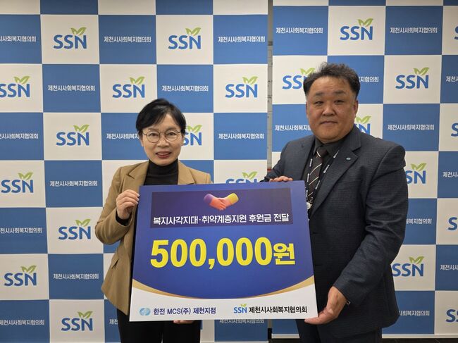 한전MCS(주)제천지점(지점장 김명한)은 지난 6일 겨울철을 맞아 복지소외계층을 위한 후원금을 제천시사회복지협의회(회장 양순경)에 전달했다.이번 후원은 지난 6월 30일에 이어 두 번째로 진행된 것으로 지역 내 복지사각지대에 놓인 어려운 이웃을 돕기 위한 취지로 마련됐다.