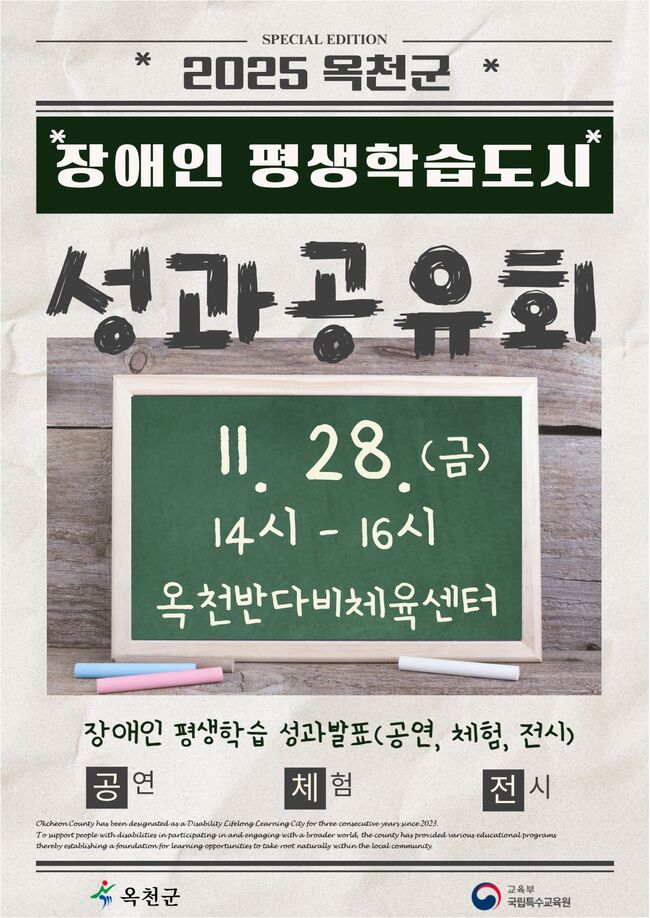 옥천군이 오는 11월 28일, 옥천반다비체육센터에서 ‘2025년 옥천군 장애인평생학습도시 성과공유회’를 개최한다.군은 2023년부터 3년 연속 교육부 장애인평생학습도시 공모에 선정됐으며 지역 내 장애인의 학습 참여 기회 확대와 다양한 평생학습 모델 구축에 힘써왔다.