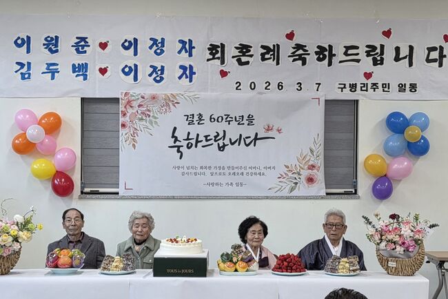 이번 회혼식은 마을 주민들이 정성껏 준비한 행사로, 이원준(98)·이정자(82) 부부와 김두백(82)·이정자(81) 부부의 결혼 60주년을 축하하기 위해 마련됐다.