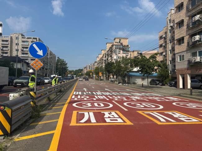 푸른동산유치원 인근 어린이보호구역 미끄럼방지 포장 정비 모습 구로구는 ‘2026년 보호구역 개선·정비 종합계획’을 수립하고 관련 사업을 추진한다고 10일 밝혔다. 어린이·노인 보호구역 59개소를 대상으로 총 41억2,300만 원을 투입한다. 보호구역 확대 지정과 통학로 개선, 무인교통단속장비 신설 등 7개 사업이 포함됐다.