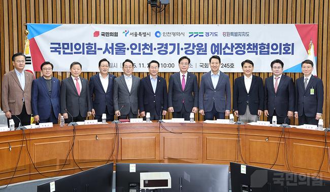 2일 오전 서울 국회의사당 회의실에서 송언석 원내대표를 비롯한 당 소속 국회의원들과 오세훈 서울시장, 유정복 인천시장, 김진태 강원도지사, 김성중 경기도 행정부지사가 참석한 가운데 국민의힘-서울.인천.경기.강원 지역민생 예산정책협의회가 열리고 있다.