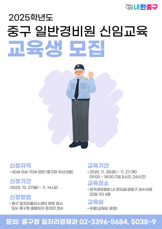 중구 일반경비원 신임교육 교육생 모집 홍보 포스터.서울 중구는 오는 11월 25일부터 27일까지 사흘간, 성동구 성수이로 20길 10에 위치한 사단법인 한국경비협회에서 ‘일반경비원 신임교육’을 실시한다고 밝혔다.