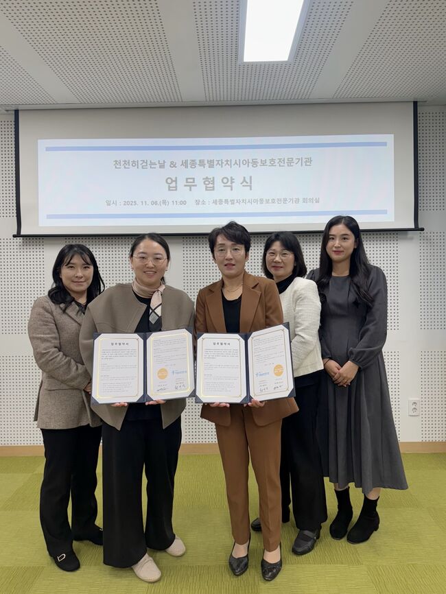 세종특별자치시아동보호전문기관(관장 황미영)은 천천히걷는날(센터장 임소라)과 아동학대 및 위기 상황에 놓인 대상자의 심리·정서적 안정 지원을 위한 업무협약을 체결했다.
