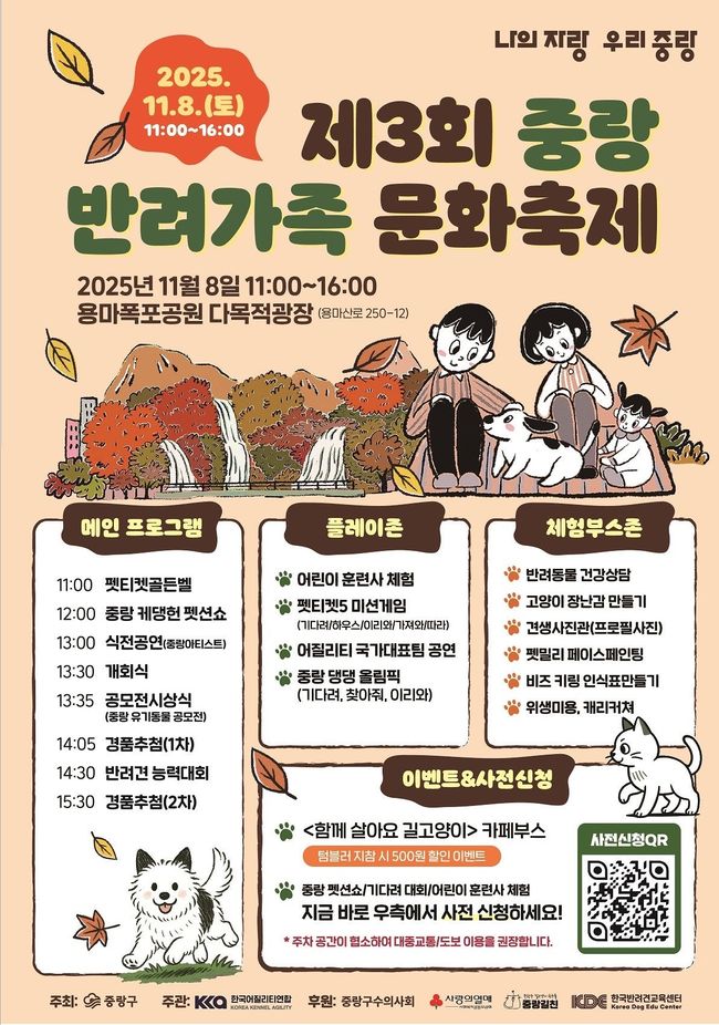 중랑구, 반려인 · 비반려인 함께 즐기는 `제3회 중랑 반려가족 문화축제` 개최 홍보 포스터.서울 중랑구(구청장 류경기)는 오는 11월 8일 토요일 오전 11시부터 용마폭포공원 다목적 광장에서 ‘제3회 중랑 반려가족 문화축제’를 개최한다고 밝혔다.
