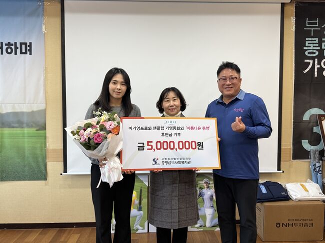 충북 증평군은 6일 프로골퍼 이가영과 그의 공식 팬카페 ‘가영동화’가 증평삼보사회복지관(관장 오종식)에 500만원을 전달했다고 밝혔다.기부금은 ‘버디 기금’으로 조성됐으며, 용인88CC 클럽하우스에서 열린 송년회 행사에서 전달됐다.