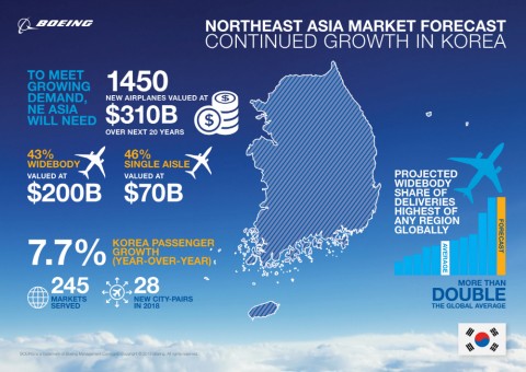 보잉은 한국 LCC의 성장을 기반으로 향후 20년 동안 동북아시아 지역의 항공 교통량이 연간 2% 증가할 것으로 전망했다. 이에 따라 동북아 지역의 항공사들은 2018년부터 2037년 사이 1450대, 금액으로는 미화 3100억달러에 이르는 신형 상용기가 필요할 것으로 내다봤다. 이를 바탕으로 2037년에는 총 1600대의 항공기가 운항될 전망이다.
