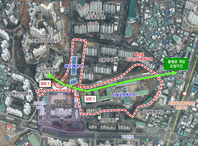 현재 신림선 병무청역 개통으로 일부 부지는 개방됐지만, 인접 국방부 부지는 여전히 통행이 제한돼 주민 불편이 이어지고 있다.