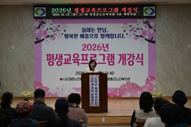 영동군노인복지관, 23일 평생교육프로그램 개강식 개최충북 영동군노인복지관(관장 신명희)은 23일 복지관 3층 대회의실에서 ‘2026년 평생교육프로그램 개강식을 열고 본격적인 운영에 돌입했다.