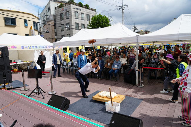전통시장 한마음 축제, 이승로 성북구청장이 떡메를 치고 있다.