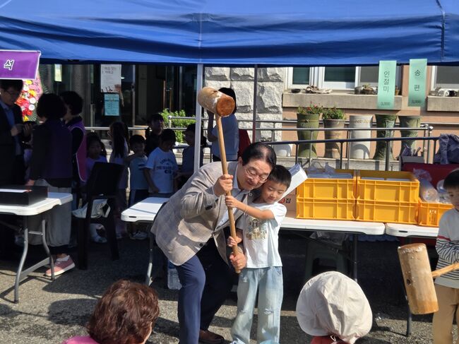 2025년 옥천군여성단체협의회가 이웃사랑 모금을 위한 바자회를 개최하는 가운데 황규철 옥천군수가 어린이의 눈높이게 맞추어 떡매를 치고 있다.