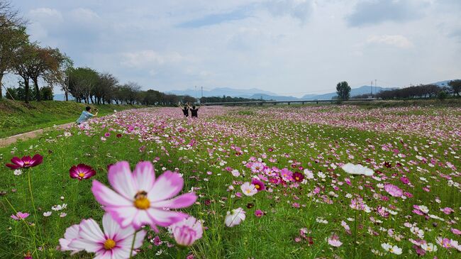 한들 거리는 코스모스를 등뒤로 사진을 한장 큐....
